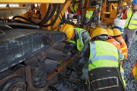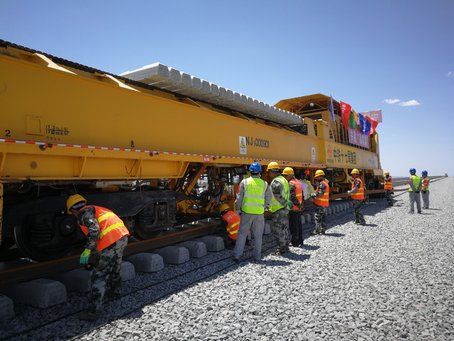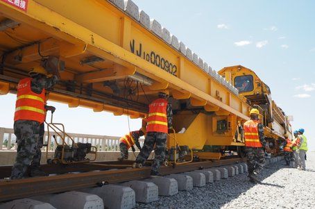 6月1日上午,位于山西天鎮(zhèn)火車站的大張高鐵施工現(xiàn)場,鋪軌機將首對500米長軌安全平穩(wěn)地鋪設(shè)