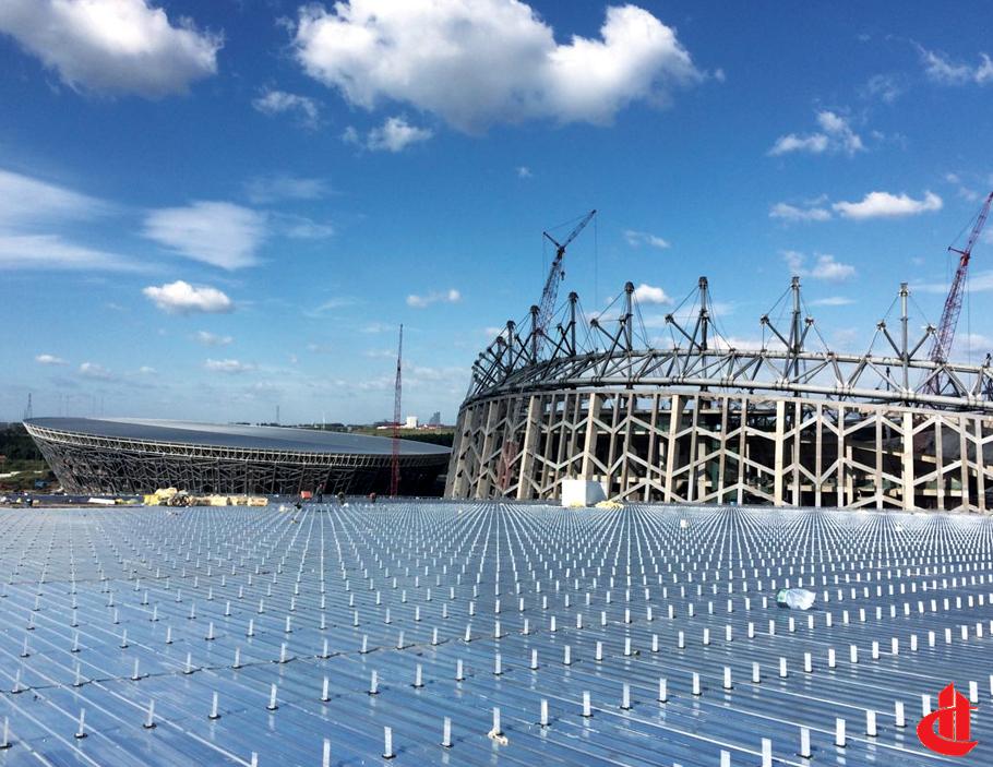 不銹鋼天溝面積1657m²,檐口鋁單板面積491m²;全民健身中心金屬屋面面積114280m²,不銹鋼天溝面積1030m²,